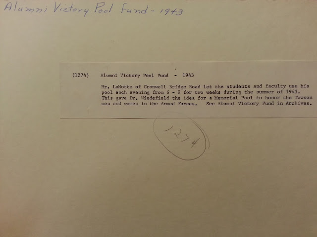 While the photos are charming and bucolic — a beautiful pool in the middle of a country setting — it is the description on the back of the photos that offers up the most interesting part of their affiliation with Towson’s history:
